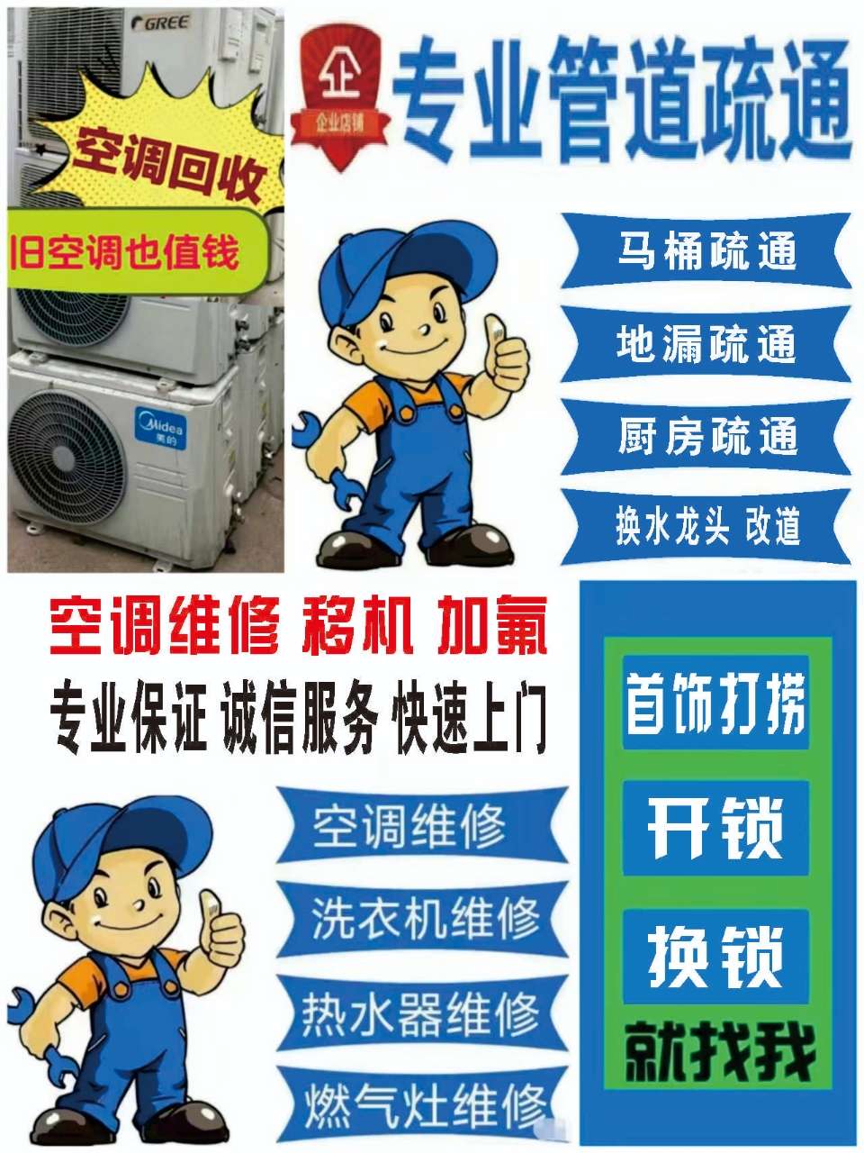 专业疏通下水道、修热水器、燃气灶、油烟机、空调维修、加氟,移机、换水龙头、开换锁等 回收废、旧空调,冰箱、洗衣机、热水器